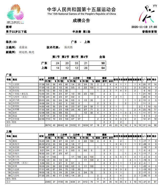 北京時間11月19日消息,2025年第十五屆全運會U22男籃進入到了半決賽的較量。在當天下午進行的一場較量中,東道主廣東隊以98-64大勝上海隊,順利打進決賽,靜待山東與北京之間的勝者。